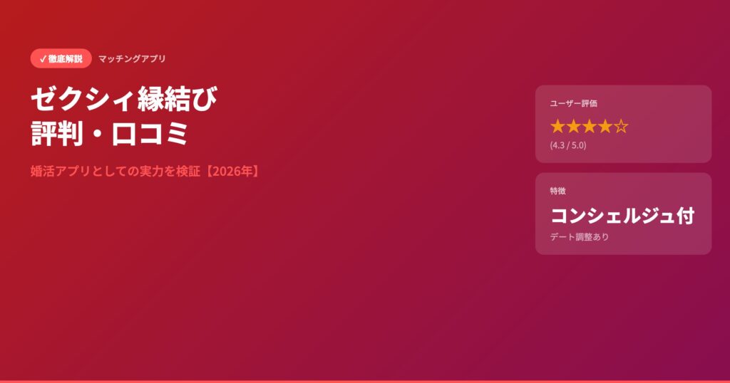 ゼクシィ縁結びの評判・口コミを徹底検証。良い評判・悪い評判をリアルなユーザーの声から分析し、メリット・デメリット、料金プラン、Omiai・ユーブライド・Pairsとの比較まで解説。2026年最新版。 マッチングアプリ